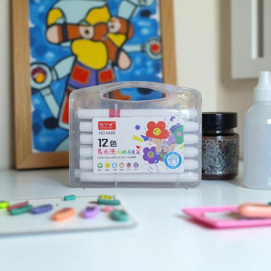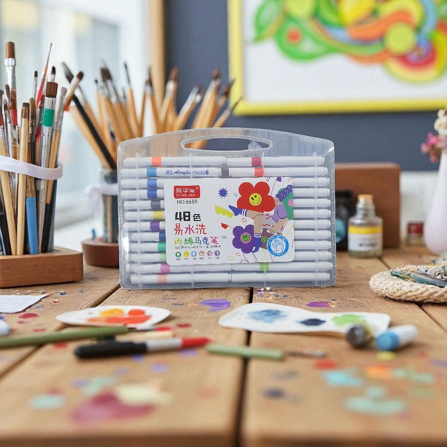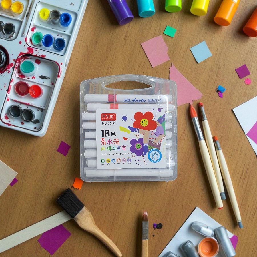 This color acrylic marker set offers a vibrant palette ideal for detailed drawing and sketching. Housed in a clear plastic case with a convenient handle, it ensures easy organization and portability. Each marker delivers smooth, consistent color, making it perfect for artists seeking precise, high-quality results in acrylic media.